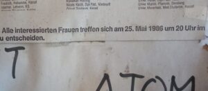 Zeitungsausschnitt mit Aufruf zu einem Treffen der Frauen am 25. Mai 1986
