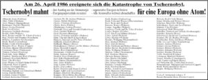Zeitungsausschnitt aus der HNA mit einer Anzeige, die viele junge Mütter unterschrieben haben. Zeitungsausschnitt mit Aufruf zu einem Treffen der Frauen am 25. Mai 1986 Wie heute schien die Frühlingssonne auf das frische Grün im Garten. Doch die Kinder durften nicht hinaus. Die radioaktive Wolke war auch nach Deutschland gezogen. Wie […]