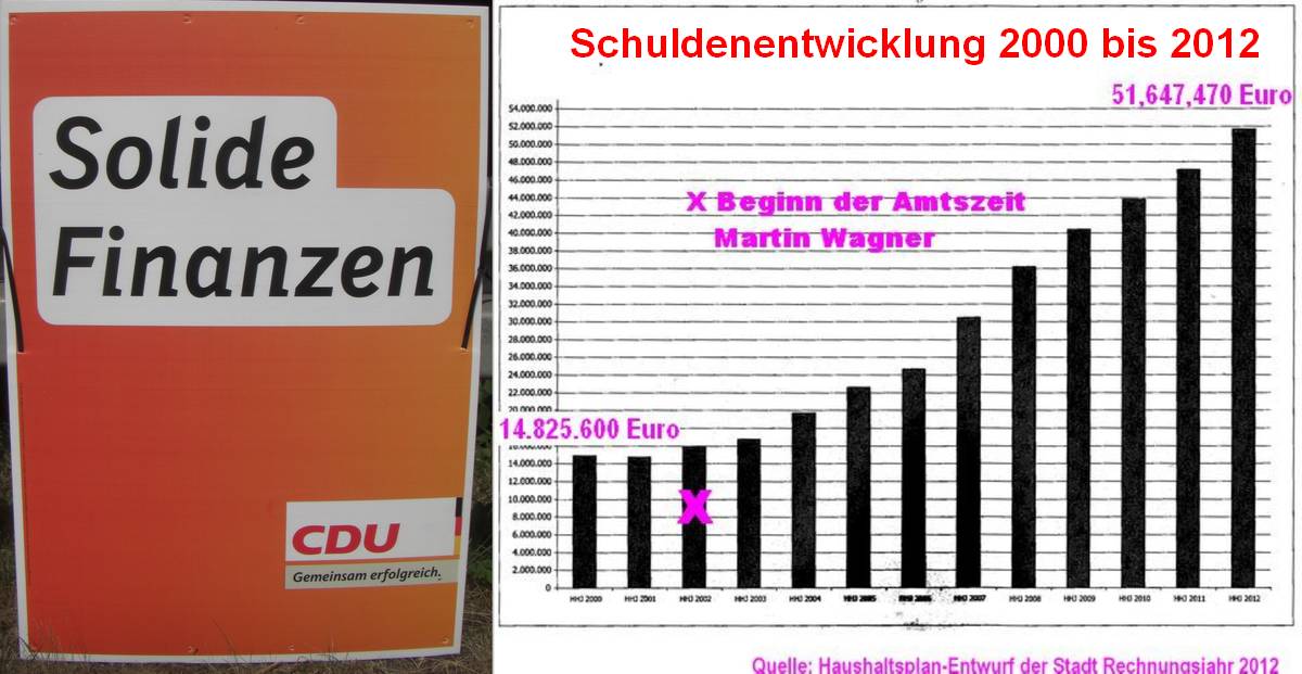 Was die CDU unter soliden Finanzen versteht, ist am städtischen Haushalt gut abzulesen. Seit Bürgermeister Martin Wagner (CDU) im Amt ist, sind die Schulden der Stadt ungebremst in die Höhe geschossen. Auch in 2013 ging es so weiter.