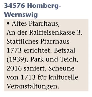 Das Alte Pfarrhaus in Wernswig fehlte. Im Vorjahr waren Haus und Scheune außen in mehreren Wochen aufwändig von Restauratoren im Zimmer- und Malerhandwerk überarbeitet worden. Ein guter Anlass, dies öffentlich zu machen. Zusätzlich war eine Ausstellung zu dem ehemaligen Pfarrer Heusinger von Waldegg und seiner Rolle im Kirchenkampf 1933/1934 zu sehen.