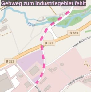 Am 9. Mai 2017 beantragte die FDP-Fraktion die Schaffung eines Gehweges ins Industriegebiet zu prüfen. Dies wurde am 30. Juni 2017 ohne Gegenstimme beschlossen.