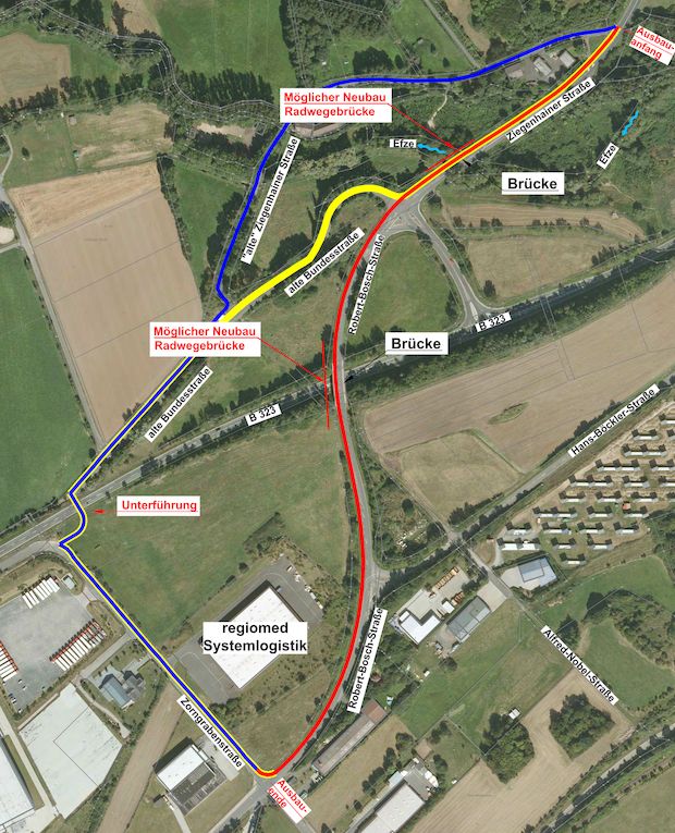 Zwei mögliche Wegeführungen für Fußgänger und Radfahrer, die bis an die Umgehungsstraße B 223 führen. Dort eine Unterführung, die zum Zorngrabenweg überleitet.