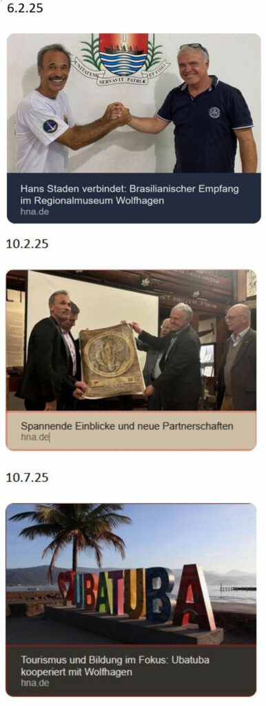 Wolfhagen und Homberg haben zusammen mit der brasilianischen Stadt Ubatuba eine Städtepartnerschaft beschlossen. Das verbindende Thema ist Hans Staden, der vor 500 Jahren in Homberg geboren, in Ubatuba gefangen gehalten und nach der Rückkehr in Wolfhagen gestorben ist. Er schrieb einen "Bestseller" über seine Erlebnisse in Brasilien, wohin er als Landsknecht aufgebrochen war.