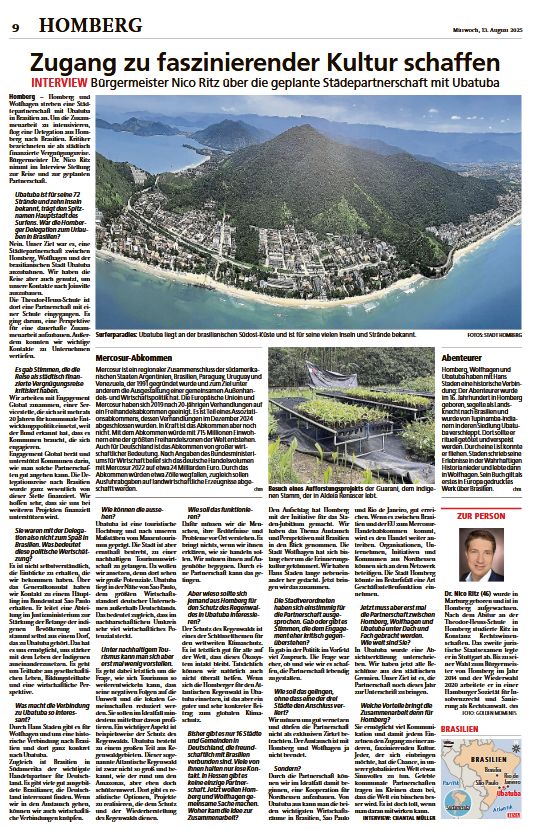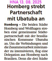 Auf der Titelseite heißt es, Homberg strebt eine Partnerschaft mit Ubatuba an. Dabei haben die Stadtverordneten die Städtepartnerschaft mit Ubatuba bereits vor 40 Tagen in der Stadtverordnetenversammlung am 3. Juli 2025 beschlossen.