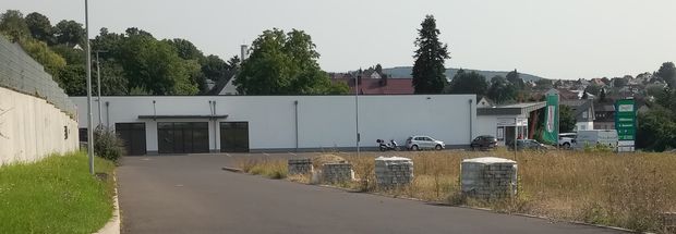 Foto: Aktueller Blick auf das Gebäude des geplanten Getränkemarktes. Die Fläche mit den gestapelten Pflastersteinen sollte eine Tankstelle werden.