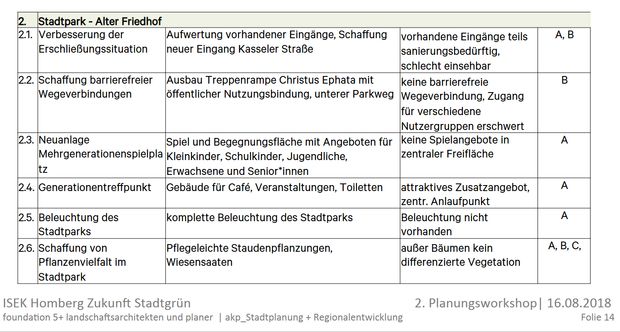 Der Entwurf zur Umgestaltung des Stadtparks „Alter Friedhof“ mit Umsetzungsvariante 1 für die Errichtung eines barrierefreien Zugangs (Parkeingang Kasseler Straße) wird beschlossen. Des Weiteren soll eine Wirtschaftlichkeitsberechnung für das Café erstellt werden.