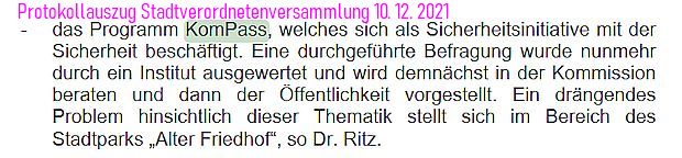 In dem Kompass-Fragebogen kommt an keiner Stelle das Wort "Stadtpark" vor. Dennoch wird in dem Bericht behauptet, dass über den Stadtpark am häufigsten geklagt wurde.