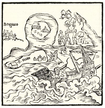 Abbildung: Schiffbruch vor der brasilianischen Küste aus der Wahrhaftigen Historia von Hans Staden