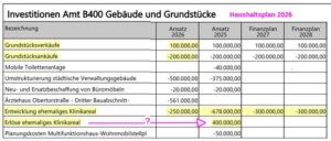 Im Haushaltsplan für 2025 waren Einnahmen in Höhe von 400.000 Euro aus dem Klinikareal eingesetzt. Wie sollen diese Einnahmen realisiert werden? Es entstanden bisher vor allem Ausgaben für Planungsleistungen und Öffentlichkeitsarbeit von Bürgermeister Dr. Ritz.