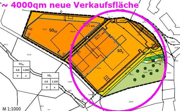 Im Änderungsplan für die derzeitig genutzte Lidlfläche sollen 4000 m² Einzelhandel oder Flächen für Dienstleister (ohne Angabe von m²) ausgewiesen werden.