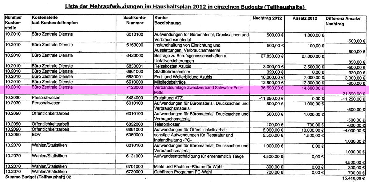 In der letzen Stadtverordnetenversammlung wurde den Stadtverordneten zu Beginn eine Liste mit den Mehrausgaben 2012 mit gut 200 Positionen ausgehändigt. Nach der Sportlerehrung erklärte Bürgermeister Martin Wagner, diese Liste über die Mehrausgaben würde reichen, ein Nachtragshaushalt wäre nicht notwendig. Er lud ein Fragen zu den Mehrausgaben zu stellen. Wer hätte diese Liste lesen können, dazu war gar keine Zeit. Im Schnelldurchgang suchte ich lediglich die großen Abweichungen. Gleich auf der ersten Seite fiel ein Betrag von 21.890 Euro auf, der als Umlage an den Zeckverband Schwalm-Eder-Mitte zu zahlen ist. 14.800 Euro waren eingeplant, 36.690 Euro sind in dem Jahr zu zahlen.