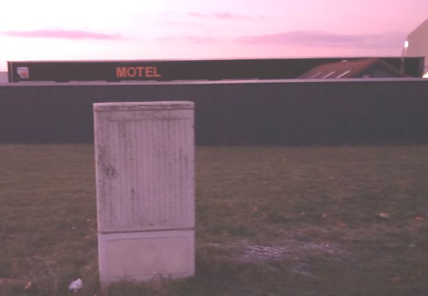Foto: Motel im Gewerbegebiet, rechts das Leuchtschild von Jysk.