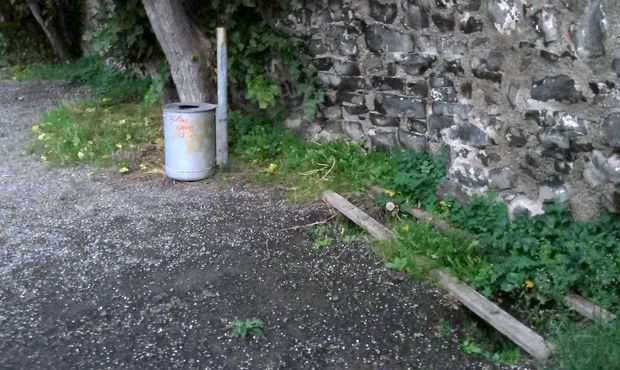 Foto: Nur noch zwei Bohlen der Bank sind übrig geblieben. Wo die Fundamente waren, sind nur noch Vertiefungen.