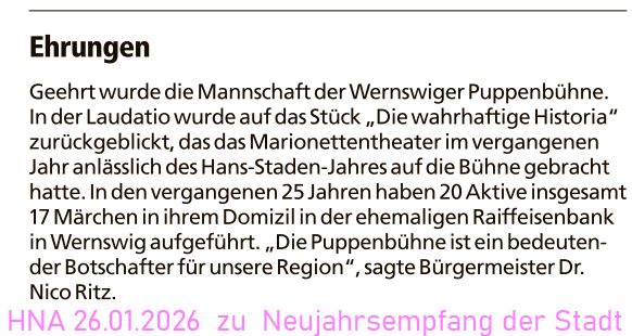 Für das Stück „Hans Stadens wahrhaftige Historia" erhielt die Puppenbühne Wernswig den internationalen Cittaslow „Best Practice Award" in der Kategorie „Quality of Urban Life Policies". Die Produktion wurde als herausragendes Beispiel für regionales kulturelles Engagement und Qualität ausgezeichnet.Die Übergabe des Preises erfolgte am 14. September 2025 im ehemaligen Gasthaus Krone durch die Stadträtin Claudia Ulrich. Unsere zahlreich beiwohnenden Mitglieder waren überwältigt.