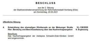 Die Stadt hat von Asklepios das Krankenhausgelände übernommen, geschenkt bekommen. Dieses Geschenk belastet die Stadt mit mehreren Millionen Euro. Zu dem Zeitpunkt des Beschlusses war bereits den Fraktionsvorsitzenden und den Stadtverordneten bekannt, dass es ein "Geschenk" war, für das die Homberger Bürger mindestens 2 Millionen Euro zu zahlen haben. Vermutlich wird es noch sehr viel mehr werden. Nutznießer der Vereinbarung ist eindeutig der Asklepios-Konzern.
