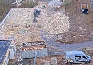 Foto: Live-Übertragung der Abrissarbeiten am Krankenhaus, das Schwesternhaus ist bereits nur noch Schutt.t dies