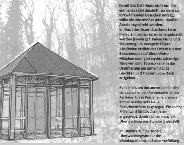 „Bei der letzten documenta befanden sich sprechende Reisighaufen in der Karlsaue. Diese Reisighaufen haben immer wieder auf Neue Besucherströme angezogen. Ein solcher Effekt wird für das Osterhaus angestrebt, damit sich eine soziale Überwachung des Standort einstellt.“ Quelle