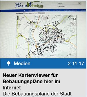 Die Bebauungspläne der Stadt Homberg stehen schon länger zur Ansicht hier auf der städtischen Internetseite zur Verfügung. In Kooperation mit dem Amt für Bodenmanagement wurde der Zugrifff auf das Geoportal Hessen, in dem die Bebauungspläne eingestellt sind, möglich gemacht.