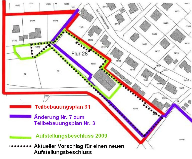 Die verschiedenen sich überlagernden Teilbebauungspläne machen die Sache kompliziert. Die Änderung in dem einen Plan ist nur möglich, wenn die Auswirkungen in die anderen Plänen eingearbeitet werden.