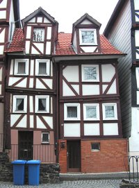 Die Stadt kündigt die Fachwerktriennale 2025 für Homberg an. Auf dem Foto dazu sind die beiden schmalen Häuser in der Pfarrstraße zu sehen.