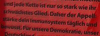 In Homberg ist der Appell in Sicherheitsglas zwischen Stahlträger anscheinend dauerhaft eingearbeitet, mit samt Rechtschreibfehler und verdrehtem Geschichtsbild.