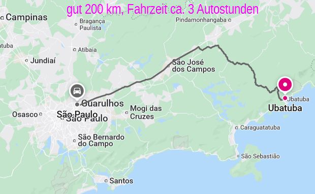 Von São Paulo bis Ubatuba braucht man mit dem Auto etwas über 3 Stunden für die Entfernung von etwas über 200 km.