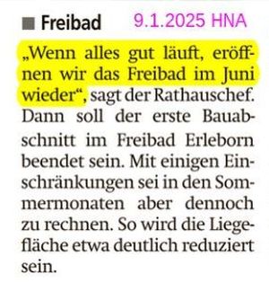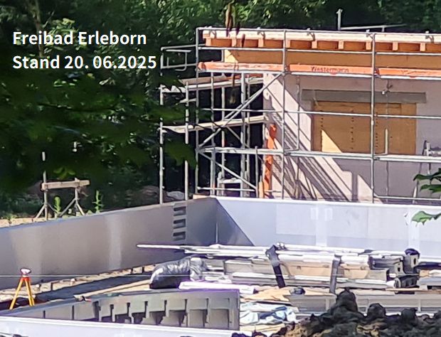 Die Stadt hat das städtische Freibad Erleborn abgerissen und einen Neubau mit Edelstahlbecken in Auftrag gegeben. Es sollte im Juni 2025 in Betrieb gehen, "wenn alles gut läuft" [1]verkündete der Bürgermeister noch im Januar.