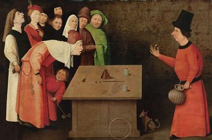 Während der Zuschauer wie gebannt auf das Hütchenspiel starrt, wird ihm die Geldbörse aus der Tasche gezogen. Der Dieb schaut dabei wie ganz unbeteiligt in die Luft. Der Gaukler und der Dieb arbeiten zusammen.