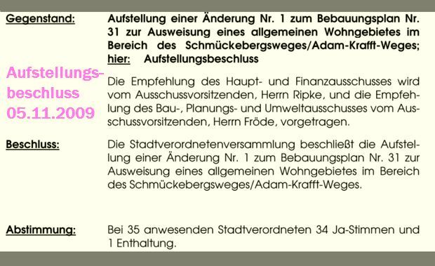 "Die Stadtverordnetenversammlung hatte bereits mit Beschluss Nr, 8 am 05.11.2009 einen Aufstellungsbeschluss gefasst, in dem ein Bauleitplanverfahren nach § 13 a BauGB zur Ausweisung eines Allgemeinen Wohngebietes im Bereich Schmückebergsweg/Adam-Krafft-Weg durchgeführt werden sollte. In Absprache mit dem Grundstückseigentümer wurde das Verfahren einige Jahre nicht weiter betrieben."