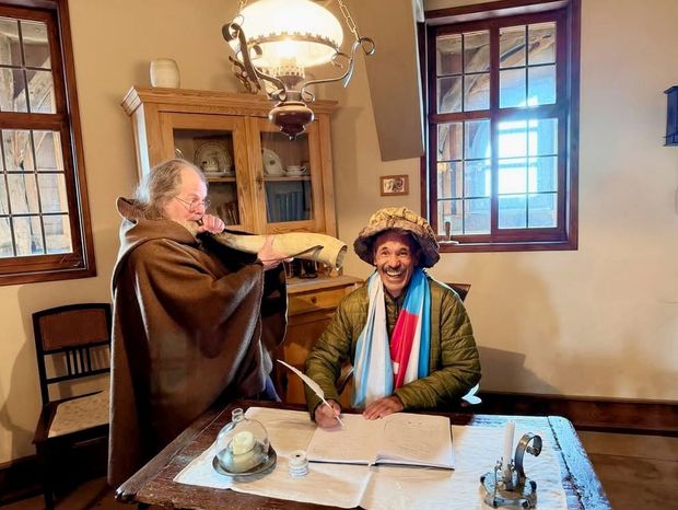 Von seinem Besuch in Homberg hat er zwei Fotos veröffentlicht, dieses in der Stube der Türmerwohnung in der Stadtkirche, und ein zweites vor dem Hans-Staden-Relief vor dem Rathaus.