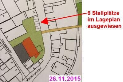 In einer frühen Planungsphase wurde noch ein Plan mit 6 Stellplätzen vorgelegt. Von denen ist jetzt nichts zu sehen An dieser Stelle in der Webergasse steht die Mauer mit den zur Zeit errichteten Spiel-Wehrgang.